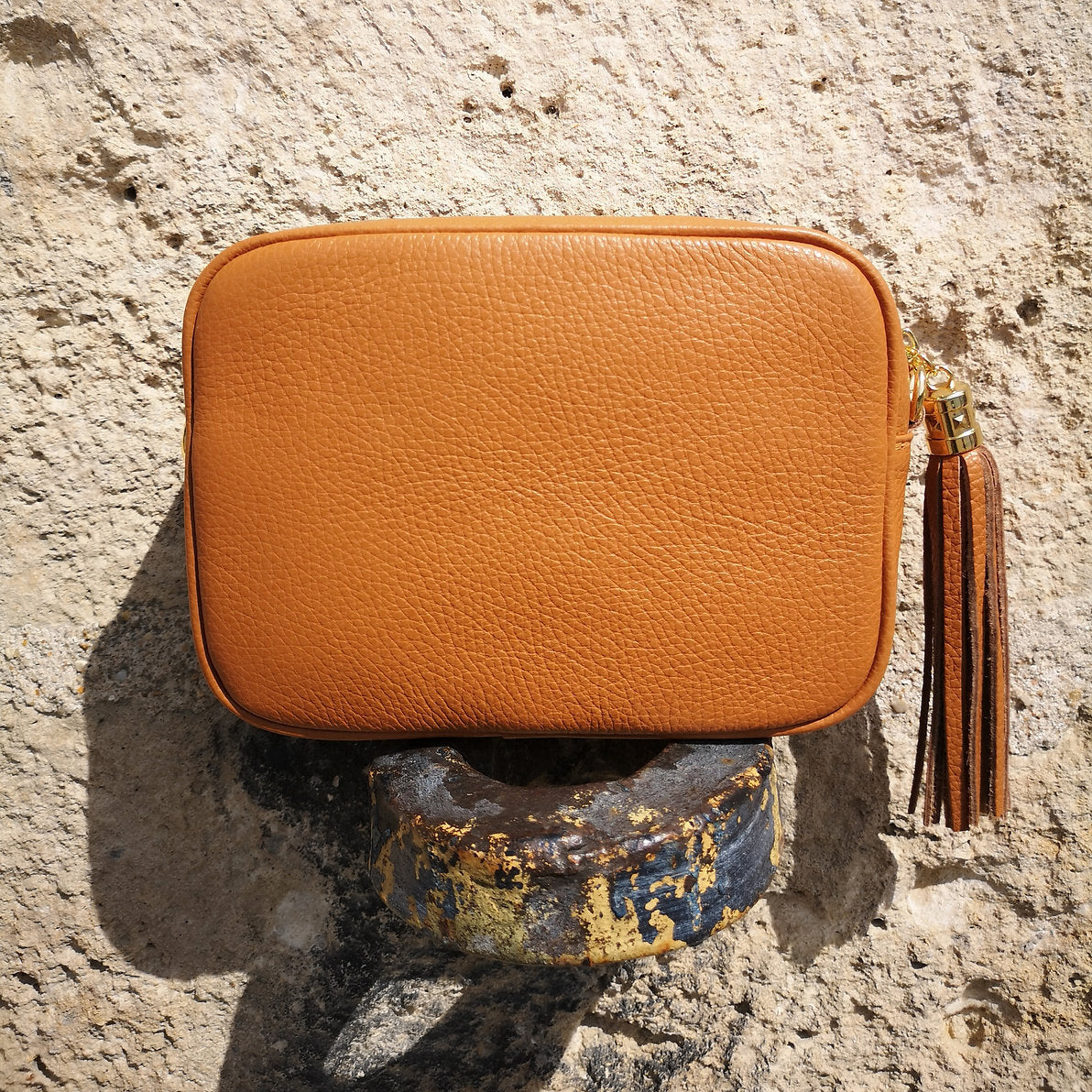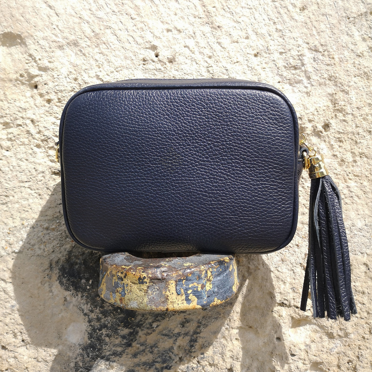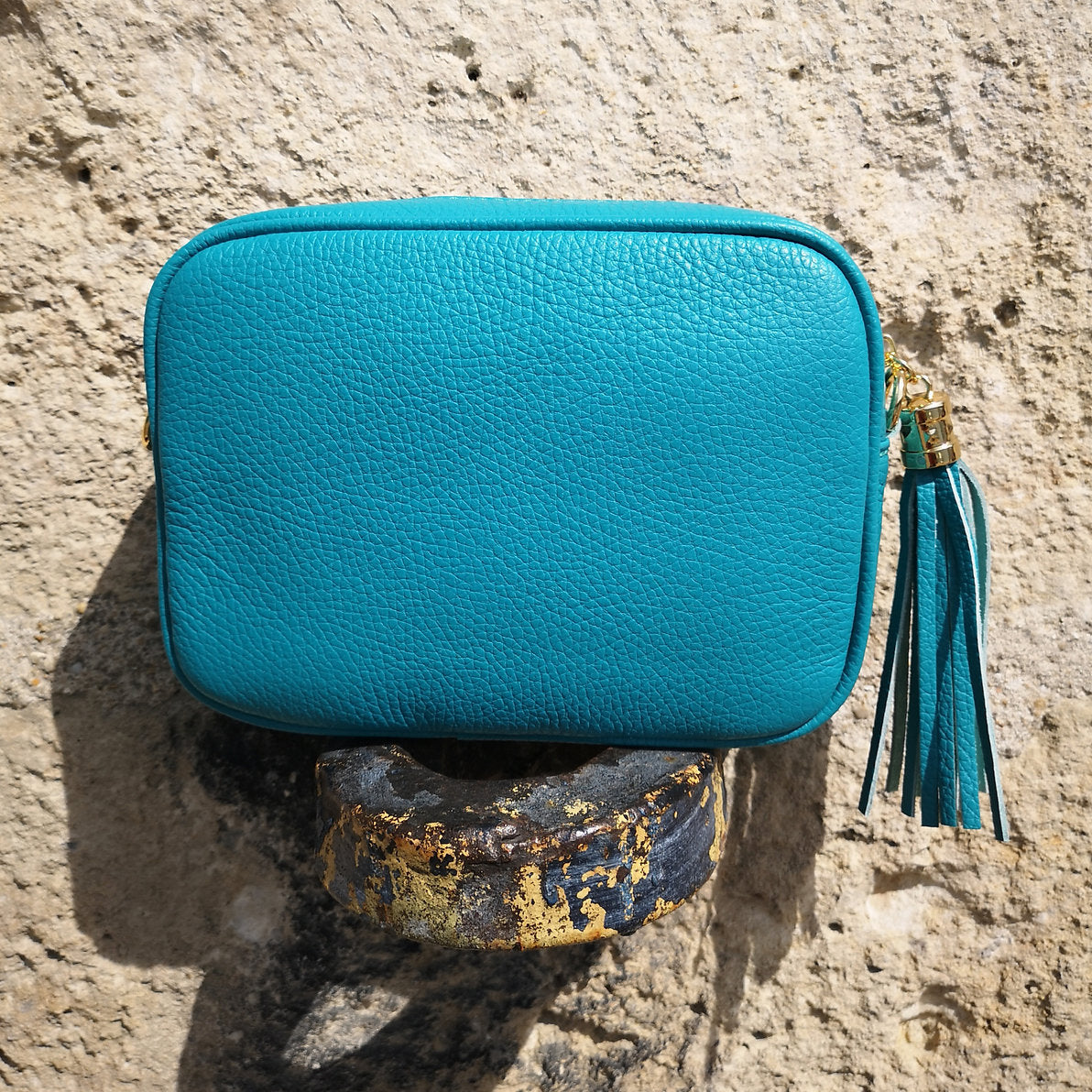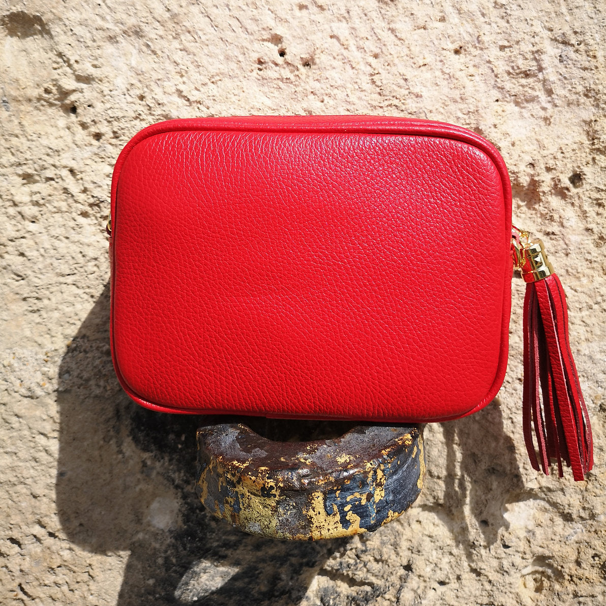 Small rectangular grainy leather bag with pompon and gold hardware