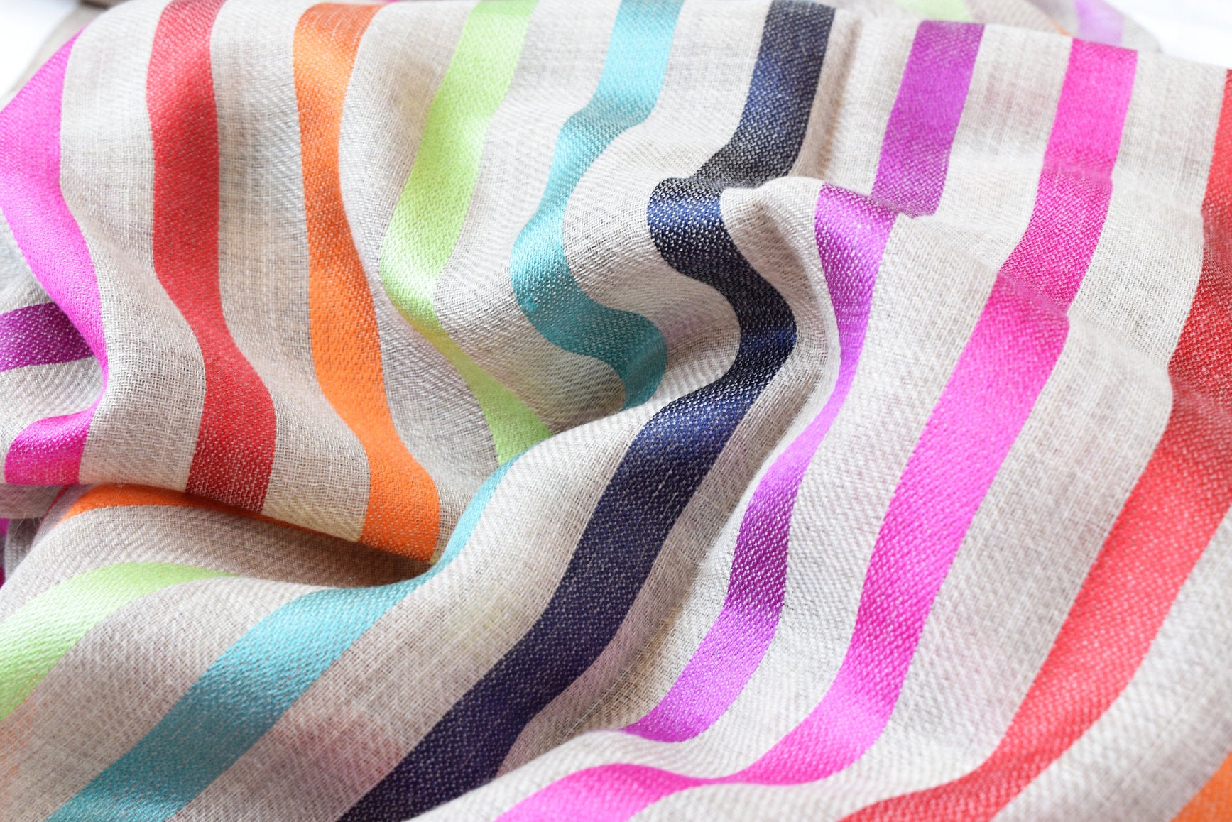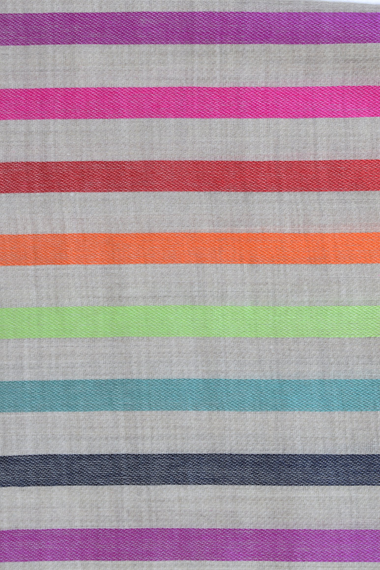 Soft beige wool and multi-colour silk stripe 200 cm x 70 cm shawl.